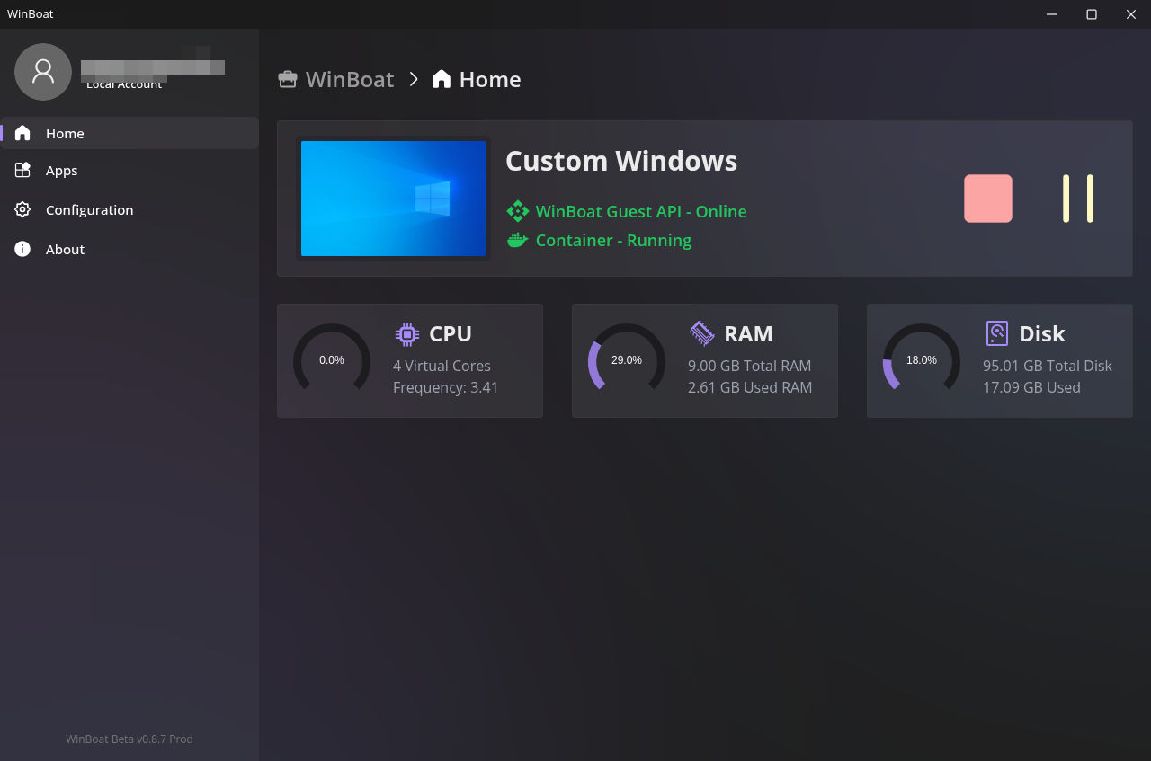 In der WinBoat Software können wir den Zustand einsehen und den Docker Container Stoppen, Beenden und wieder Starten.
