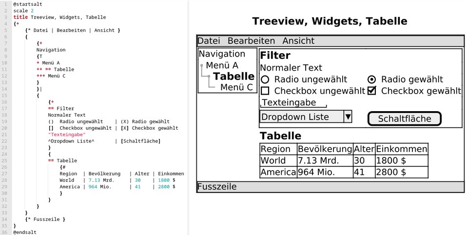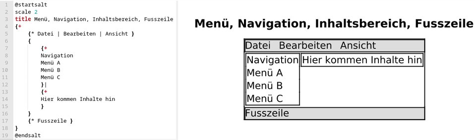 Auf der linken Seite seht ihr den beschreibenden Text und rechts das grafische Ergebnis. Ein Salt-Diagramm beginnt immer mit @startsalt und endet mit @endsalt. Dazwischen könnt ihr mit den geschweiften Klammern Hierarchieebenen der UI-Elemente erzeugen. Die Angabe von scale vergrössert die grafische Darstellung und title ist selbsterklärend. Das Pluszeichen nach der ersten Klammer zeichnet einen Rahmen um die in den Klammern enthaltenen Elemente.